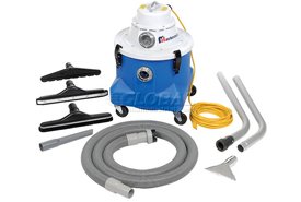 POLY TANK WET AND DRY VACUUM Rotationally molded of high impact plastic with 1/4" thick wall construction. Poly tanks resist chemical and dents, and rust proof. No-tip wide base design features a low center of gravity for excellent stability. Features: Trap-Sack dry filtration system includes removable cloth filter and large totally enclosed disposable paper filter bag. Wet pick up adapter with automatic float shutoff protects the by-pass motor from water damage when removing liquids. Includes 30'L power cord. 10'L vinyl hose; 5'L curved metal wand; carpet tool; floor tool; upholstery tool; crevice tool; squeegee. Caster style vacuums are equipped with four 2-1/2" ball bearing swivel casters. UL and CUL listed.